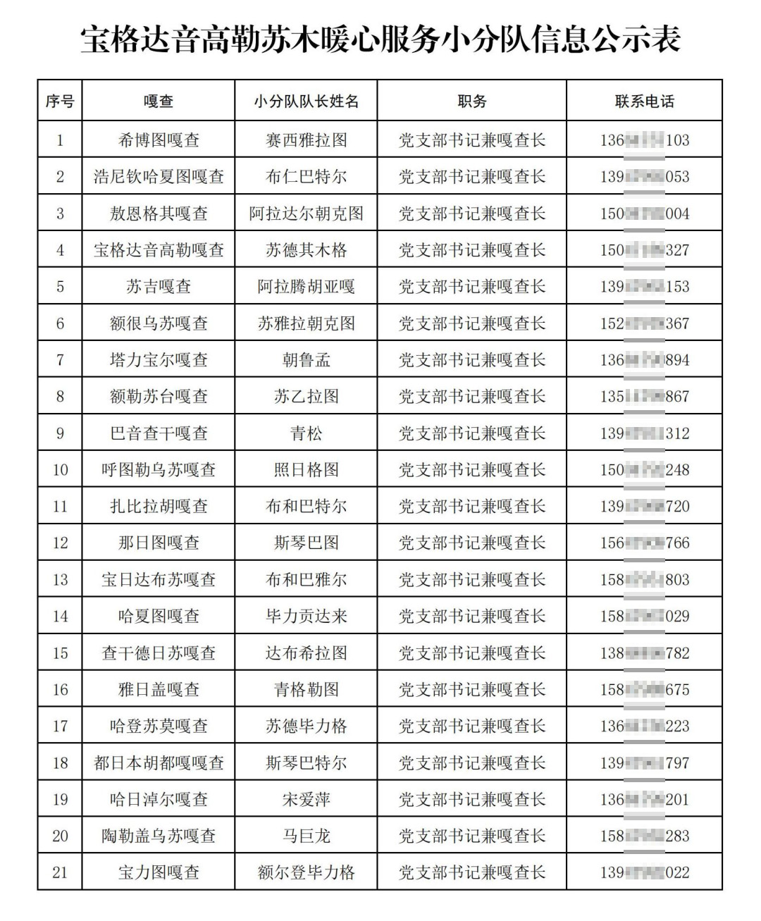 为有效应对疫情防控新情况新问题新挑战,推动基层党组织和党员在科学精准防控中更好发挥作用,宝格达音髙勒苏木党委以网格为基本单元成立了暖心服务小分队。暖心服务小分队针对空巢独居老年人、困境儿童、孕产妇、重度残疾人、重病患者等特殊群体,在元旦春节期间开展送医送药、特困群体排查、隐患排查、走访慰问、帮办代办、互帮互助等暖心服务,切实解决广大人民群众的“急难愁盼”,进一步发挥基层党组织战斗堡垒作用,打通服务群众的“最后一米”。现将各嘎查暖心小分队负责人相关信息予以公布,牧民群众如有需要可及时联系。